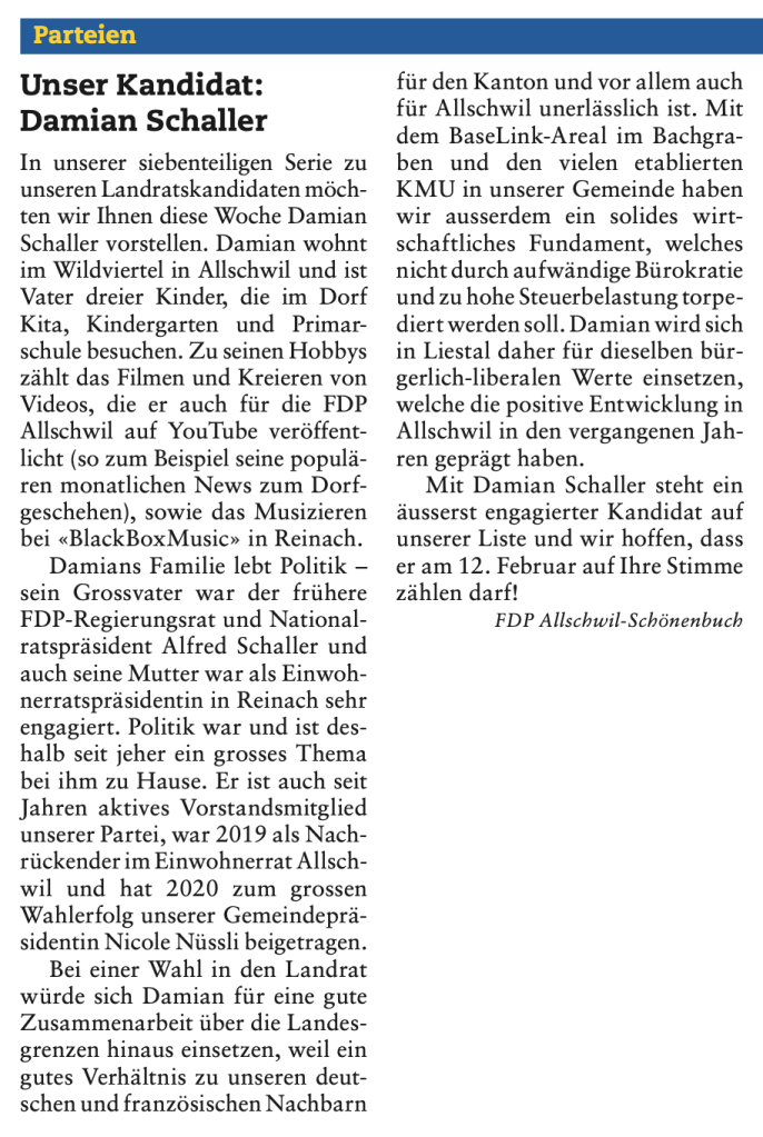 Von ganzem Herzen wünsche ich Ihnen einen guten Start ins neue Jahr! Ich bin schon sehr gespannt auf den Wahlkampf für den Einwohnerrat und Gemeinderat in Allschwil, ein Blick zurück auf meine politischen Aktivitäten in den letzten Jahren geben mir Zuversicht, auf Ihre Unterstützung für die Liste 1 der FDP zählen zu dürfen. Ich habe 2023 für den Baselbieter Landrat kandidiert und bin in Unterstützungskomitees für nationalen Abstimmungen, wie z.B. die Renteninitiative, aktiv.
